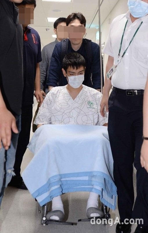 이날 탑은 소속사 YG 엔터테인먼트 소속 매니저들과 함께 환자복을 입고 마스크를 착용, 휠체어를 탄 채 모습을 드러냈다.