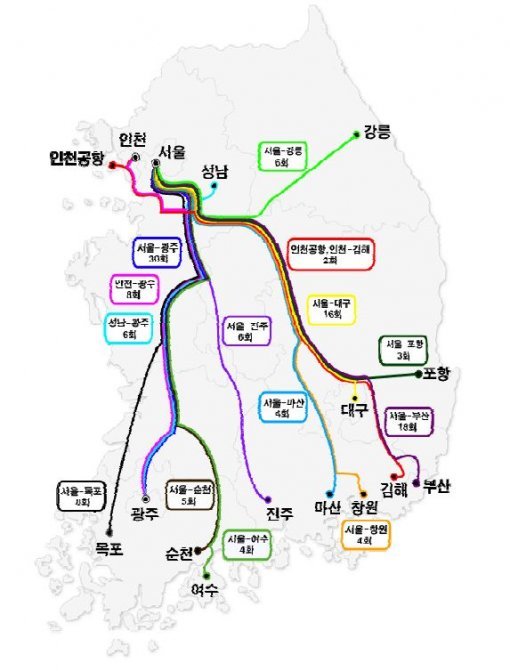 이번에 추가되는 12개 노선은 ▲서울~대구 ▲서울~순천 ▲서울~여수 ▲서울~진주 ▲성남~광주 ▲인천~광주 ▲서울~창원 ▲서울~목포 ▲서울~마산 ▲서울~포항 ▲서울~강릉 ▲인천공항~김해다. 모두 운송수요가 많고 200㎞가 넘는 장거리 노선이다.