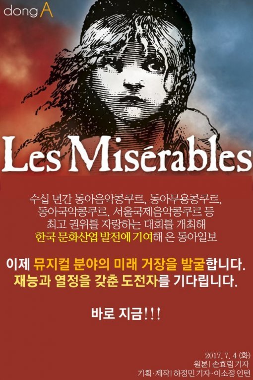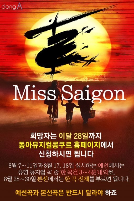 #. 희망자는 이달 28일까지 동아뮤지컬콩쿠르 홈페이지에서 신청하면 됩니다. 8월 7~11일과 8월 17, 18일 실시하는 예선에서는 유명 뮤지컬 곡 중 한 곡을 3~4분 내외로, 8월 28~30일 본선에서는 한 곡 전체를 부르면 됩니다. 예선곡과 본선곡은 반드시 달라야 하죠. #. 수십 년간 동아음악콩쿠르, 동아무용콩쿠르, 동아국악콩쿠르, 서울국제음악콩쿠르 등 최고 권위를 자랑하는 대회를 개최해 한국 문화산업 발전에 기여해 온 동아일보.