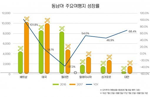 그 외에 동남아 주요 인기 여행지인 말레이시아, 싱가포르, 대만 등도 50% 내외의 성장을 기록하며 동남아 지역은 여전히 내국인이 선호하는 여름 휴가지임을 증명했다.