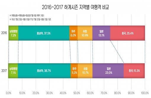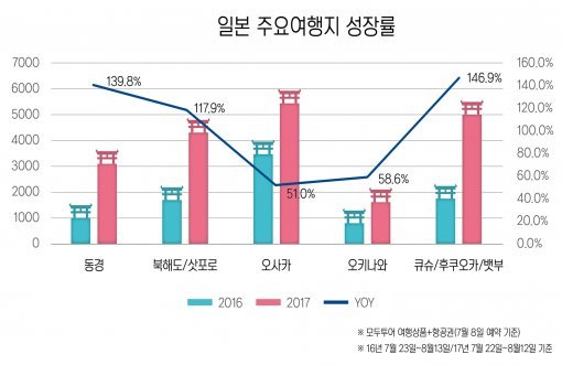 유독 긴 연휴가 많은 2017년이지만 여전히 7월 말부터 8월중순까지가 남녀노소 불문 가장 기다려지는 휴가시즌이다. 올해 여름, 소비자들이 선택한 여행지는 어디이고 어떤 특징이 있는지 모두투어의 예약 통계를 통해 알아본다. ▼일본여행 급증, 중국여행 급감
