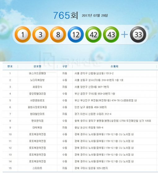 로또 765회는 서울 신림동·성수동·신정동, 부산 구서동·부전동, 인천 용현동, 경기 이천시, 충북 청주시, 충남 논산시, 경북 경주시, 경북 구미시 등에서 1등 당첨자가 나왔다.
