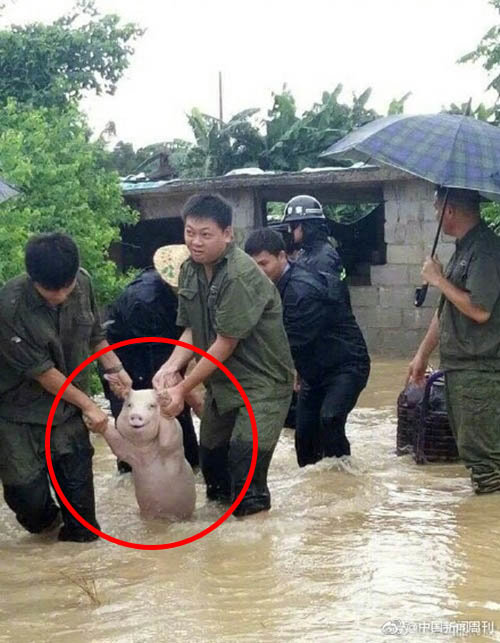 중국 네티즌들은 이 사진을 널리 공유하며 “돼지가 재난 당한 주민들에게 미소로 격려해주는 것 같다”, “구조 후 소시지가 되지 않기를 바란다” 등의 반응을 보였다.