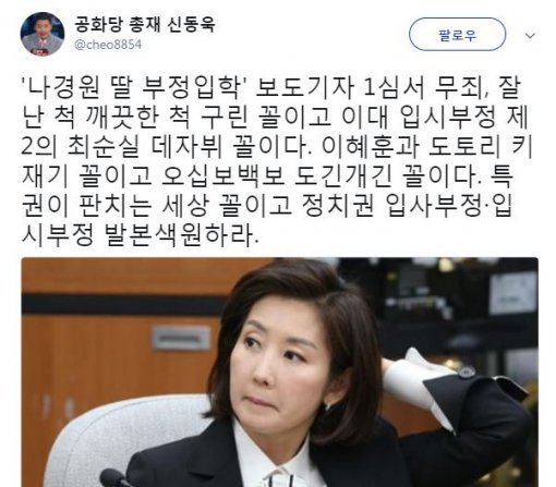 신 총재는 이날 트위터에 "\'나경원 딸 부정입학\' 보도기자 1심서 무죄, 잘난 척 깨끗한 척 구린 꼴이고 이대 입시부정 제2의 최순실 데자뷔 꼴이다. 이혜훈과 도토리 키 재기 꼴이고 오십보백보 도긴개긴 꼴이다. 특권이 판치는 세상 꼴이고 정치권 입사부정·입시부정 발본색원하라."고 썼다.