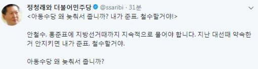 정 전 의원은 5일 트위터에 "아동수당 왜 늦춰서 줍니까? 내가 준표, 철수할거야!. 안철수, 홍준표에 지방선거때까지 지속적으로 물어야 합니다. 지난 대선때 약속한거 안지키면 내가 준표, 철수할거야. 아동수당 왜 늦춰서 줍니까?"라고 글을 올렸다.