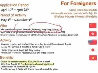 국내 한 저비용 항공사가 대학생 대상 구인 포스터에 대만 홍콩을 중국과 병기했다는 이유로 중국 관영 매체와 네티즌들로부터 뭇매를 맞았다.