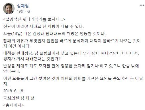 한국당 소속 심 부의장은 이날 오후 자신의 페이스북에 “진단이 바로 돼야 제대로 된 처방이 나올 수 있다”며 이같이 평가했다.