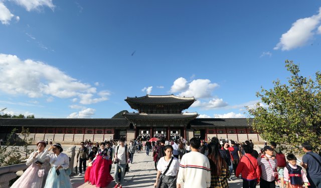 추석 연휴 마지막 날인 26일 오후 서울 종로구 경복궁에서 시민들과 외국인 관광객들이 나들이를 즐기고 있다. © News1