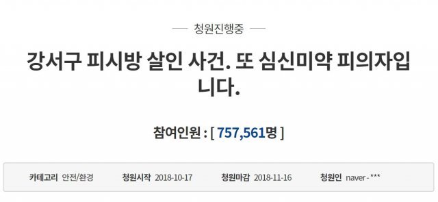 국민청원 게시판을 보면 게시 나흘 만인 이날 오전 11시45분 기준 ‘강서구 피시방 살인 사건. 또 심신미약 피의자입니다’ 제목의 글에 75만7561명이 동의했다. 최다 추천 청원 목록 2순위인 ‘음주운전 교통사고로 친구 인생이 박살 났습니다. 제발 도와주세요’ 동의자(37만3184명)의 약 2배다.