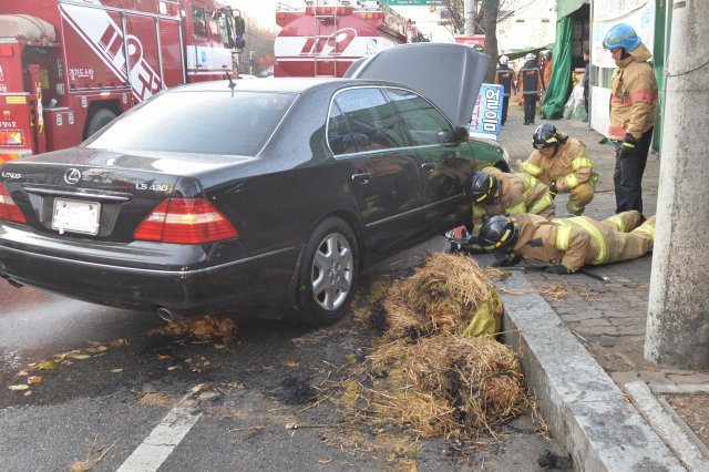 운전자 김모씨는 차량에 지푸라기 포대가 낀 사실을 모르고 수백m 가량 주행하다가 차량 앞부분에서 연기가 나자 도로변에 긴급히 차량을 세우고 소방서에 신고를 하려던 참이었다.