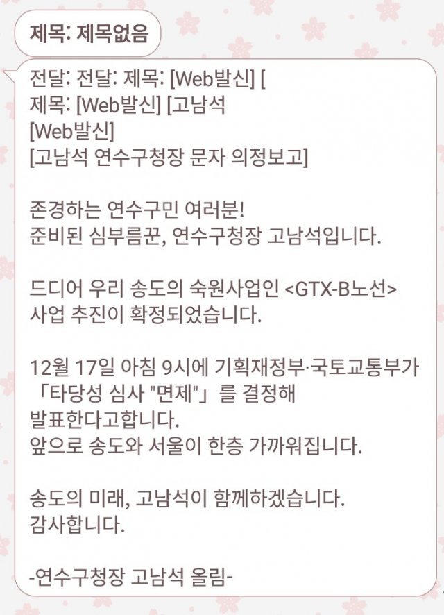 또 ‘12월17일 아침 9시에 기획재정부 국토교통부가 타당성 심사 “면제”를 결정해 발표한다고 합니다. 앞으로 송도와 서울이 한층 가까워집니다. 송도의 미래 고남석이 함께하겠습니다. 감사합니다. 연수구청장 고남석 올림’이라고 기재돼 있다.