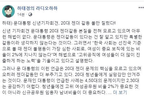 하태경 바른미래당 의원은 10일 문대통령 신년기자회견 중 \'젠더 갈등\'과 관련한 답변에 대해 "20대 젠더갈등 불만 질렀다"고 비판했다.