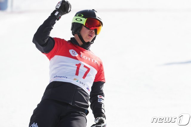 17일 오후 강원도 평창군 봉평면 휘닉스 평창에서 열린 ‘2019 국제스키연맹(FIS) 스노보드 월드컵 평창’ 평행대회전 경기에서 3위를 확정지은 이상호가 기뻐하고 있다. 2019.2.17/뉴스1 © News1