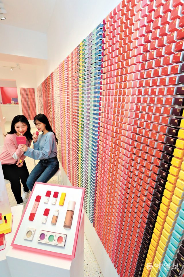 다채로운 색상을 재미있는 블록 형태로 구현한 색조 화장품 브랜드 ‘스톤브릭’이 론칭 기념행사를 열었다. 17일 서울 마포구 홍익대 인근에 오픈한 스톤브릭 안테나숍에서 모델들이 화장품을 사용해보고 있다. 스톤브릭은 립스틱 색상만 95개에 이른다.