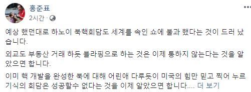 홍준표 전 자유한국당 대표는 28일 제2차 북미정상회담이 결렬된 것에 대해 "예상 했던대로 하노이 북핵회담도 세계를 속인 쇼에 불과 했다는 것이 드러 났다"고 목소리를 높였다.