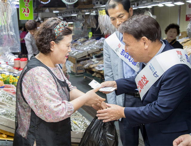 강임준 전북 군산시장이 ‘군산사랑상품권’으로 재래시장에서 물건을 구입하고 있다. 군산시는 지난해 9월 상품권 발행을 시작했다. 군산시 제공
