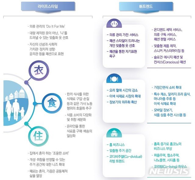 식품 분야에서는 ▲가정간편식(HMR) 시장 부상 ▲식품 소비 다양화 ▲구매 대행화 등이 새로운 트렌드로 조사됐다.
