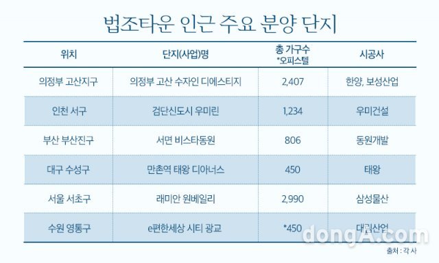 동원개발은 부산에서 ‘서면 비스타동원’ 분양에 들어갔다. 거제동 법조타운이 근거리에 위치한다. 전용 59~84㎡ 총 806가구 중 210가구 일반분양 된다. 법원, 검찰청의 이전이 확정된 대구 수성구 연호지구와 가까운 곳에서는 ‘만촌역 태왕 디아너스’가 분양 중이다. 전용면적 84~157㎡ 총 450가구 규모다.