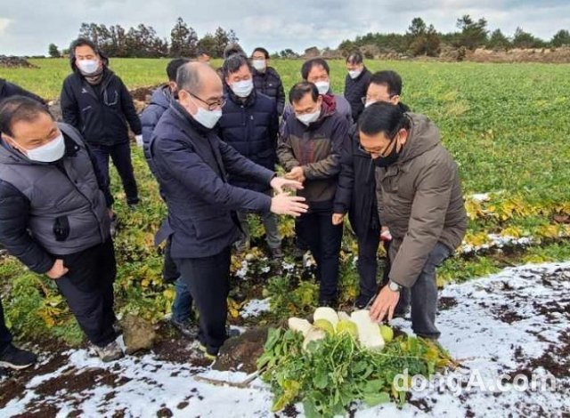 유찬형 농협중앙회 부회장이 17일 한파·폭설 피해를 입은 제주지역 월동채소 재배농가를 방문해 패해상황을 점검하고 현장의 의견을 청취한 후 지원방안을 논의했다.