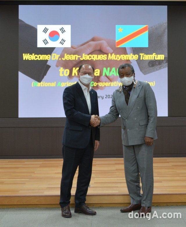 2일 서울 중구 농협중앙회 본관에서 김태환 농협축산경제 대표이사(왼쪽)와 콩고민주공화국 국립생물의학연구소 무옘배 박사가 기념촬영하고 있다. 이날 양측은 축산분야 국제협력을 논의하는 자리를 가졌다. 농협 제공