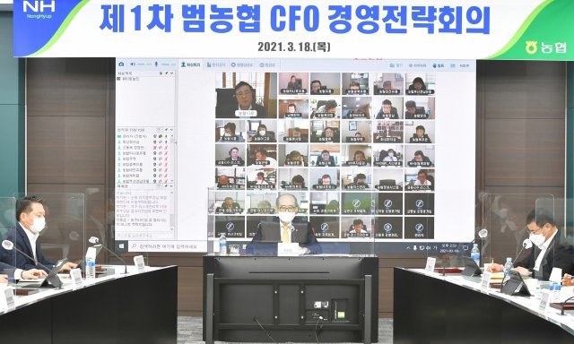 유찬형 농협중앙회 부회장(가운데)이 18일 서울 중구 농협중앙회 본관에서 ‘2021년 제1차 범농협 CFO 경영전략회의’를 주재하고 있다. 농협 제공