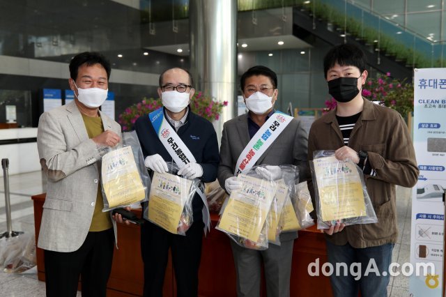 우리농업지키기운동본부가 9일 농협중앙회 본관 로비에서 우리농산물 소비촉진 캠페인을 실시했다. 우측에서 두번째 우리농업지키기운동본부 김용택 대표, 세번째 유찬형 농협중앙회 부회장. 농협 제공