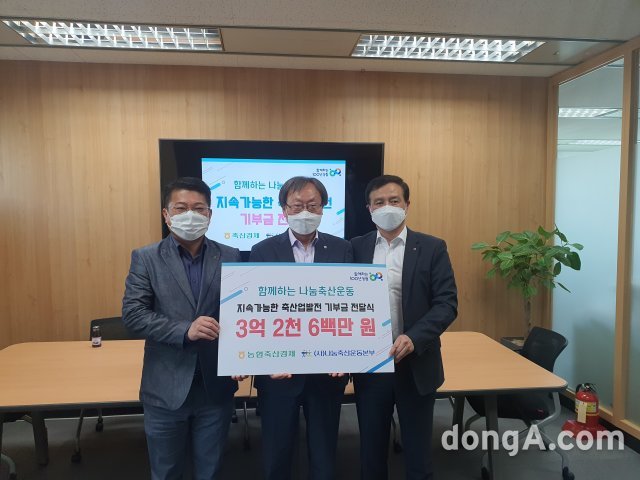 NH농협중앙회노동조합과 전국금융산업노동조합 NH농협지부가 사단법인 나눔축산운동본부에게 21일 NH농협중앙회노동조합 위원장실에서 지속가능한 축산업 발전을 위한 후원금 3억2600만 원을 전달했다. 왼쪽부터 김용택 위원장, 안승일 나눔축산사무총장, 김동혁 위원장이 후원금 전달식을 갖고 기념촬영을 하고 있다. 농협 제공