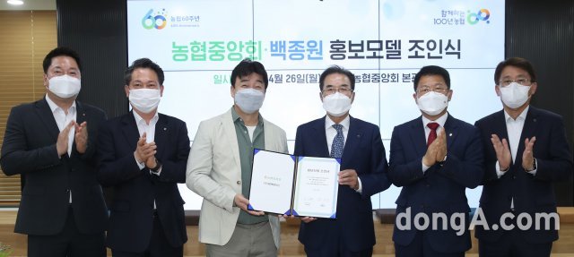 이성희 농협중앙회장(사진 오른쪽)은 26일 서울 중구 농협중앙회 본관에서 백종원 대표와 광고모델 계약을 체결하고 조인식을 가졌다. 농협 제공
