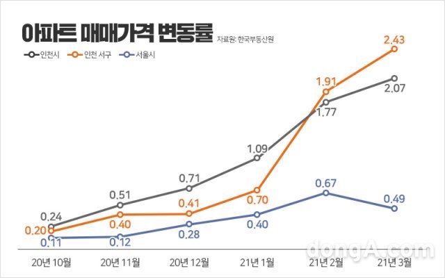 인천 서구 일대 아파트 값이 연일 강세다. 한국부동산원에 따르면 인천 아파트값은 지난해 10월부터 올 3월까지 6개월 연속 올랐다. 지난 1월과 2월 상승폭이 각각 1.09%와 1.77%. 3월에는 2.07%를 기록하며 상승 폭이 커졌다.