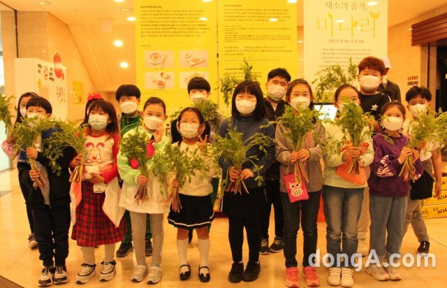 서울미동초등학교 3학년 재학생들이 20일 서울 중구 농업박물관에서 열린 채소의 품격, 미나리전 개막식에 참석해 전시내용을 관람하고, 미나리 수확 체험을 한 후 기념촬영을 하고 있다. 농협 제공