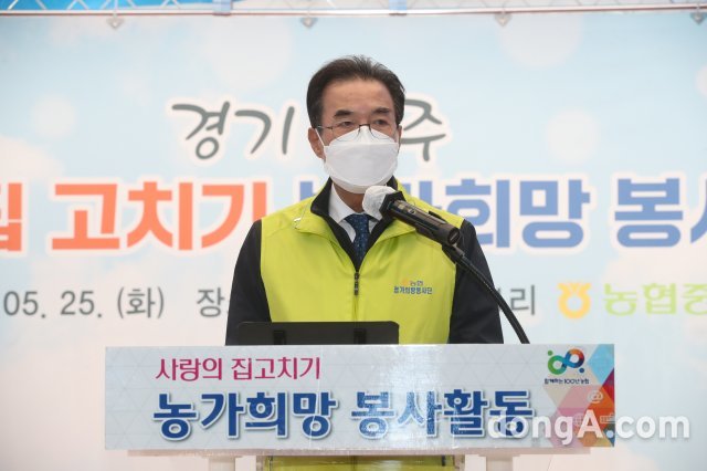 25일 경기 파주시에서 진행된 사랑의 집고치기 봉사활동 현장에서 이성희 농협중앙회장이 인사말을 하고 있다. 농협 제공