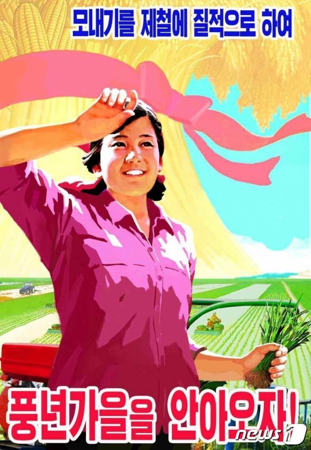 (평양 노동신문=뉴스1) = 북한 노동당 기관지 노동신문은 28일 조선노동당출판사에서 “당면한 영농전투에로 불러일으키는 선전화들을 창작했다”라고 보도했다. 선전화에는 “모내기를 제철에 질적으로 하여 풍년 가을을 안아오자”라는 문구가 적혀 있다. [국내에서만 사용가능. 재배포 금지. DB 금지. For Use Only in the Republic of Korea. Redistribution Prohibited] rodongphoto@news1.kr