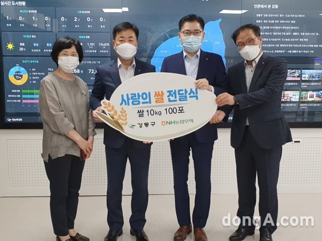 NH농협무역이 창립 31주년을 맞이해 어려운 이웃과 지역주민을 위해 16일 서울 강동구청에서 함께하는 쌀 나눔행사를 실시했다. 김재기 NH농협무역 대표이사(왼쪽에서 두번째), 이정훈 강동구청장 등이 행사 후 기념 촬영을 하고 있다. 농협 제공