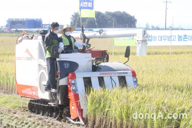 이성희 농협중앙회장(사진 오른쪽)이 18일 충남 보령에서 벼 수확 시연을 하고 있다. 농협 제공