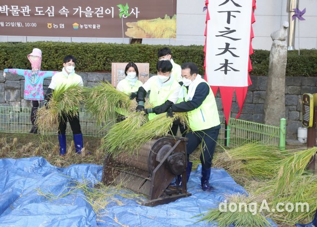 농협중앙회 농업박물관이 25일 서울 중구 농업박물관 앞 야외체험농장에서 전통 방식 벼 가을걷이 행사를 개최했다.