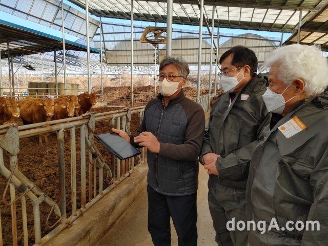 안병우 농협경제지주 축산경제 대표이사(사진 가운데)가 취임 첫날인 12일, 미래축산 구현의 답을 찾기 위해 경기도 평택 소재 스마트 축사 현장을 찾아 축산농가의 애로사항을 청취하고 있다.