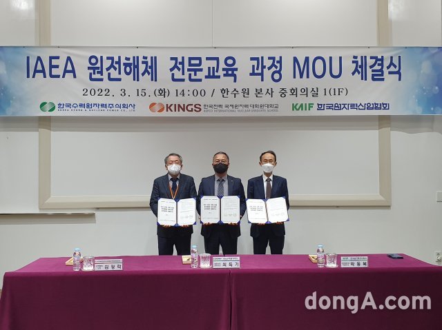 한국수력원자력이 15일 경주 본사에서 한국전력 국제원자력 대학원대학교, 한국원자력산업협회와 ‘IAEA 인증 원전해체 전문교육 과정 개설을 위한 양해각서’를 체결했다.
