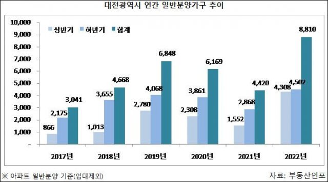 최근 6년 대전광역시 일반분양가구는 2017년엔 3041가구에 불과했으며 이후 점차 증가하며 2019년 6848가구로 정점을 찍은 후 다시 줄었다.