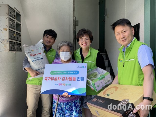 농협중앙회 지역사회공헌부 임직원을 중심으로 구성된 행복이음봉사단원들은 지난 7일 서울 거주 월남전 참전용사 장상용 선생과 독립유공자 유가족인 나승란 여사 가정을 각각 방문해 쌀과 과일 등 우리 농산물로 구성된 추석 선물과 함께 감사의 마음을 전했다.