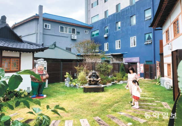 1일 문을 연 인천 동구 금곡로 ‘배다리 아트스테이1930’을 아이와 함께 찾은 여성이 주변을 돌아보고 있다. 이곳은 배다리시장 전성기 시절 있던 여인숙을 활용해 만든 복합문화공간이다. 1930년에 만들어진 진도여인숙 등 3개의 여인숙을 리모델링해 갤러리와 숙박 체험, 개방형 공원 등으로 조성했다.