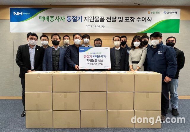 농협물류는 8일 서울 광진구 동서울종합터미널에서 한진과 함께 '택배종사자 동절기 지원물품 전달 및 표창 수여식'을 열고 방한조끼 800벌 전달, 우수 대리점주 및 배송기사 표창 등 상생협력활동을 펼쳤다. 농협 제공