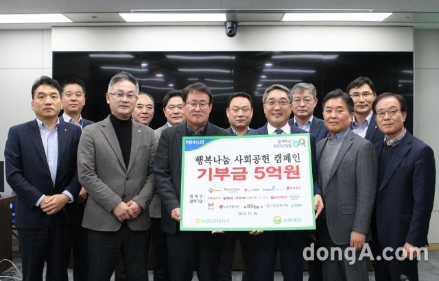 농협경제지주가 20일 농업인과 소외이웃을 위해 16개 협력회사와 함께 조성한 ‘하나로 행복나눔 사회공헌 캠페인’ 기금 5억 원을 농협재단에 기부했다.