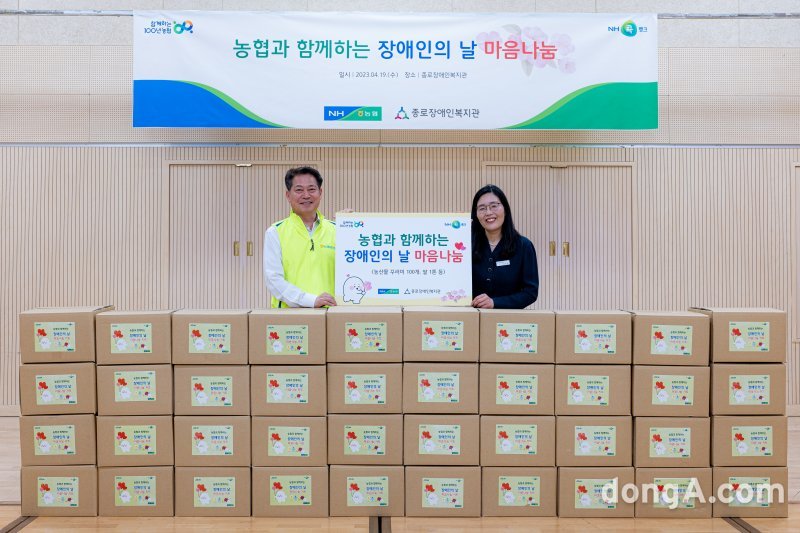 조소행 농협중앙회 상호금융대표이사(왼쪽)가 김은영 종로장애인복지관장(오른쪽)에게 20일 ‘장애인의 날 마음나눔’ 우리 농산물 꾸러미를 전달하고 있다. 농협 제공