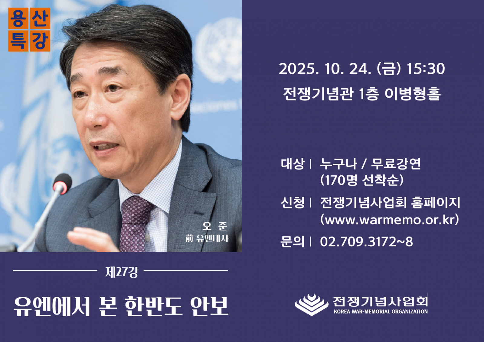 전쟁기념사업회(회장 백승주, 이하 사업회)는 24일 오후 전쟁기념관 이병형홀에서 오준 전 유엔대사를 연사로 초청해 용산특강 제27강을 개최한다.