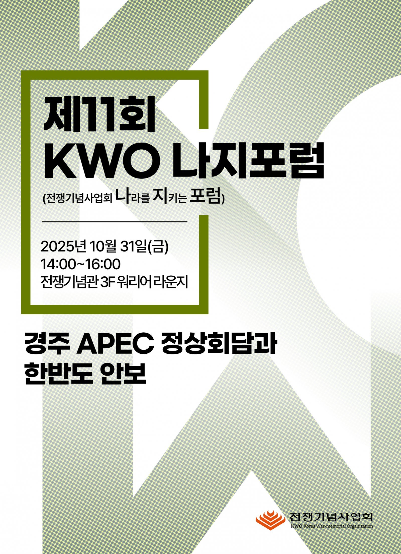 전쟁기념사업회(회장 백승주, 이하 사업회)가 31일 오후 2시 전쟁기념관 3층 워리어라운지에서 ‘경주 APEC 정상회담과 한반도 안보’라는 주제로 제11회 KWO 나지포럼을 개최했다.