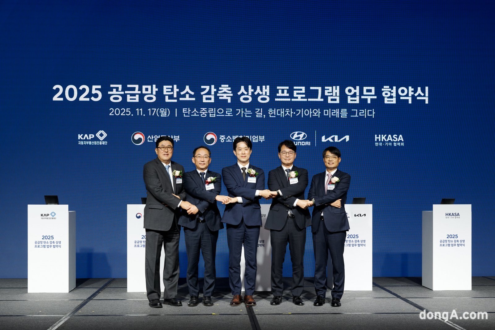 현대자동차·기아는 산업통상부 중소벤처기업부·자동차부품산업진흥재단·부품 협력사들과 함께 ‘공급망 탄소 감축 상생 프로그램 업무 협약’을 체결했다고 17일 밝혔다.