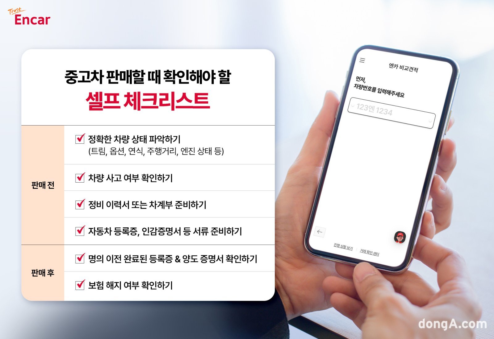 엔카닷컴은 25일 소비자들이 연말 중고차 판매에 앞서 확인해야 할 핵심 사항을 안내했다. 엔카닷컴에 따르면 연말에는 중고차 매물이 크게 늘지만, SUV·경차 등 인기 차종과 특정 모델은 수요가 유지되거나 오히려 가격이 오르는 사례도 나타난다. 이에 따라 트림·옵션·사고 이력 등 차량 상태를 정확히 파악하고 시장 시세를 비교하는 과정이 필수라는 설명이다.