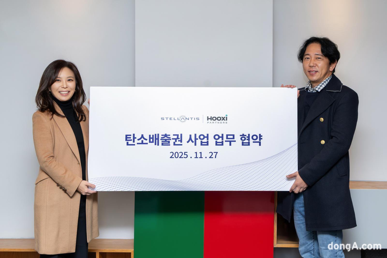 스텔란티스코리아와 후시파트너스가 27일 탄소배출권 사업 업무 협약에 대한 양해각서를 체결하고, 국내 최초로 전기차 고객 개인의 탄소 감축실적을 실질적 이익으로 환원하는 프로그램 도입에 나선다.
