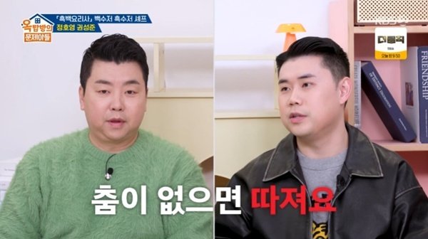 22일 오후 방송된 KBS 2TV 예능 프로그램 ‘옥탑방의 문제아들’(이하 ‘옥문아’)에서는 ‘흑백요리사’ 초대 우승자 셰프 권성준(나폴리 맛피아)과 ‘흑백요리사2’ 톱4 셰프 정호영이 퀴즈에 도전했다.