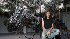 미술관 외벽엔 검은 현수막에 ‘The Language of the Enemy’(적군의 언어)라는 글귀만 적혀 있고, 입구는 흙으로 가로 막혀 있습니다.‘싹’ 전시를 기점으로 30주년을 맞은 아트선재센터가 해적에게 점령당한 것 같은 모습인데요.미술관 건물 전체를 재료로 입구부터 전시장은 물론 강당까지 전부 낯선 공간으로 만든 아드리안 비야르 로하스.어떤 생각으로 이번 전시를 준비했는지, 그에게 직접 들어볼 수 있었습니다. 인터뷰 내용을 소개합니다.전시장에서 만난 로하스와 기사를 위해 사진 촬영을 할 때의 에피소드입니다.로하스가 스위스 바젤 바이엘러 재단 미술관에서 전시했던 ‘세탁기 작품’ 앞이었는데, 작품과 좀 더 가까이 서서 포즈를 취하기 위해 흙 언덕에 서도 괜찮냐고 물었습니다. 로하스의 답입니다.“안돼요. 흙 위에 발자국부터 모든 흔적들은 다 컴퓨터로 계산해서 정확히 구현한 거예요. 아무렇게 쌓은 것처럼 보일 수도 있겠지만…”사진을 위해 미소를 지어볼 수 있느냐는 주문에도 로하스